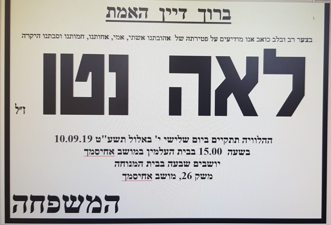 לויית לאה נטו ז"ל, אמה של בתיה גואטה תתקיים היום, יום ג', שעה 15:00 בבית העלמין באחיסמך.