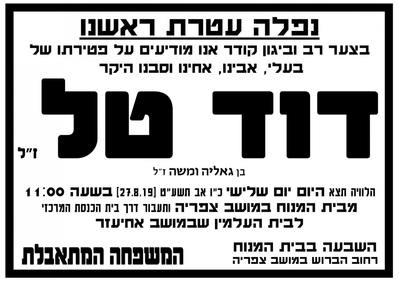 הלוויה תצא ביום שלישי, כו' אב, 27/8/19, מבית המנוח במושב צפריה .